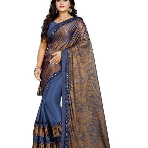 Generic Women’s Lycra Blend Sarees (Blue And Brown , 5-6Mtrs)