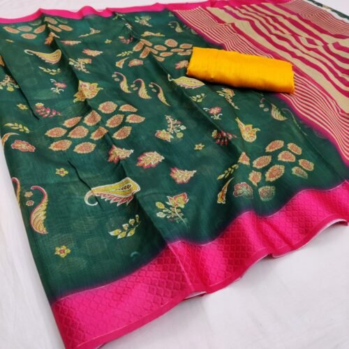 Generic Women’s Linen Blend Digital Print Saree With Blouse (Yellow, 5-6 Mtrs)