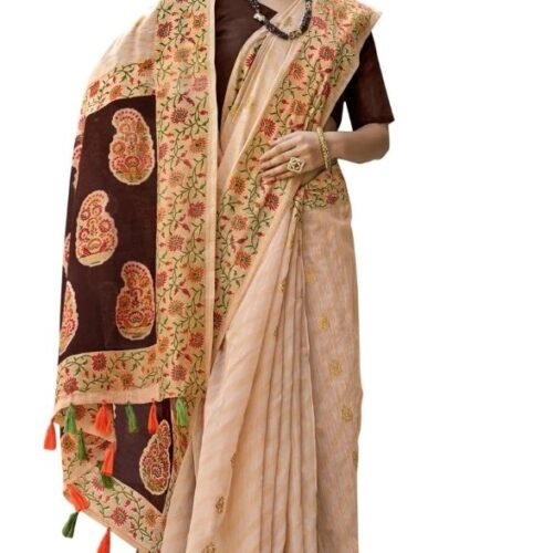 Generic Women’s Cotton Stripes Printed, Foil And Stone Embellished Saree With Blouse (Beige, 5-6 Mtrs)