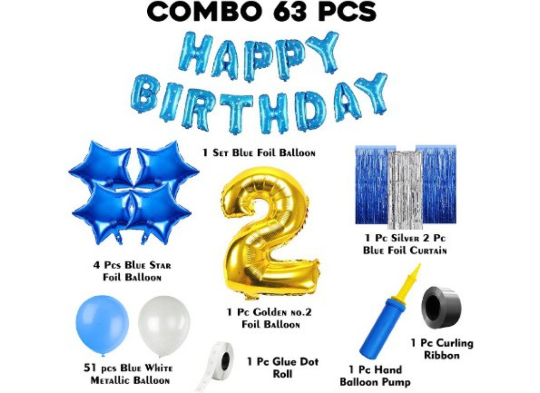• Package Contains: 1set blue alphabet happy birthday foil balloons, 1Pc number 2 golden foil balloon 16″, 4Pcs blue star foil baloons, 2Pcs blue foil curtain, 1Pc silver foil curtain, 51Pcs blue & white metallic balloons, 1Pc glue dot, 1 Pc hand balloon pump and 1Pc silver curling ribbon roll.