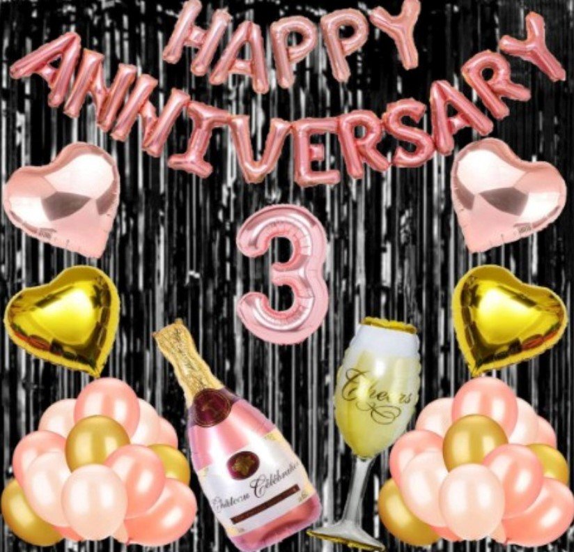 3rd Anniversary Rose Gold Foil Balloons with Happy Decoration Items Set