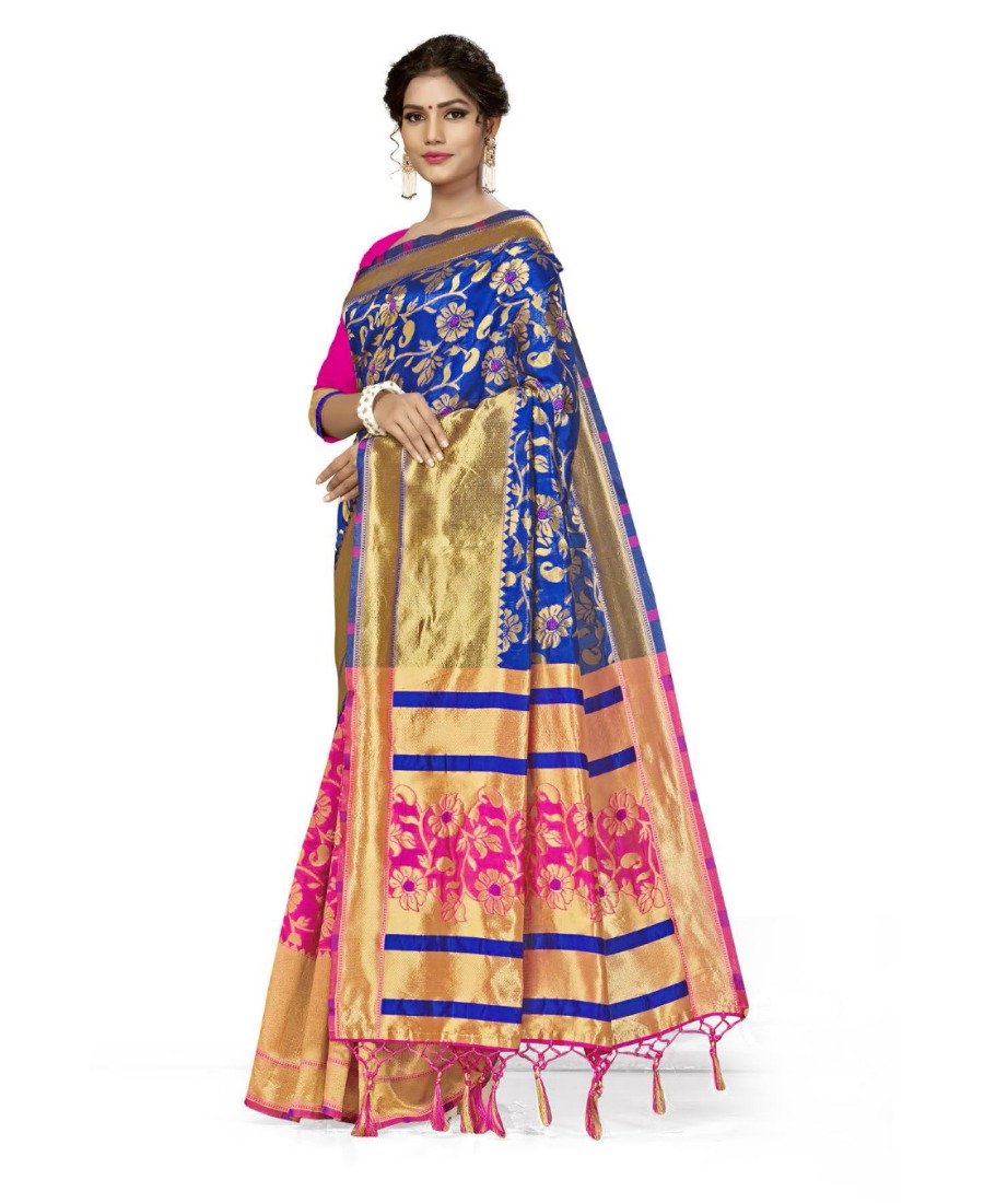 Generic Women’s Banarasi Silk Saree With Blouse (Pink, Navy Blue, 5-6Mtrs)