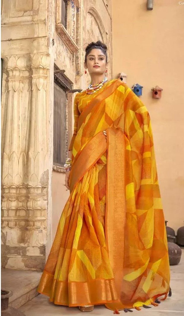 Generic Women’s Cotton Geomatric Printed Saree With Blouse (Yellow, 5-6 Mtrs)