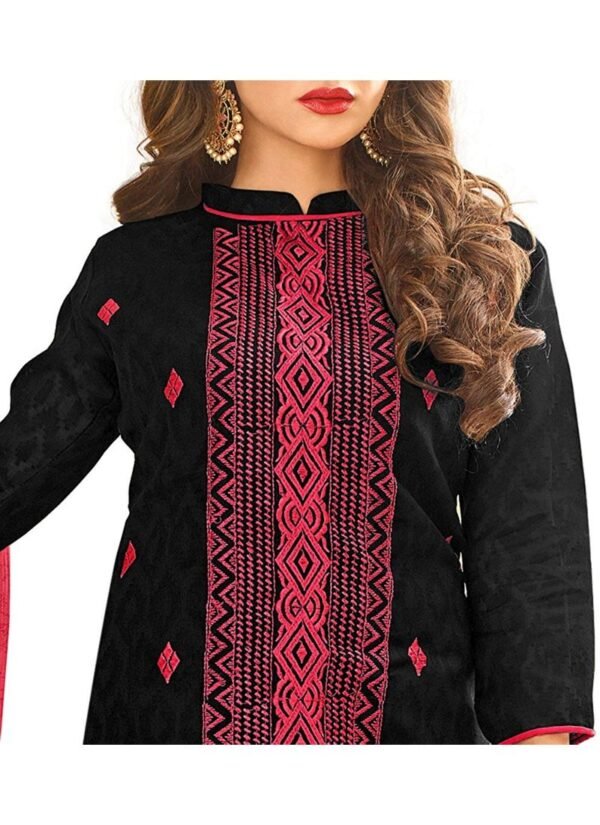 Generic Women’s Cotton Jacquard Unstitched Salwar-Suit Material With Dupatta (Black, 2 Mtr). <br>Top Fabric: Cotton Jacquard, Bottom Fabric: Cotton, Dupatta Fabric: Chiffon. <br>Top Color: Black, Bottom Color: Pink, Dupatta Color: Pink. <br>Top Length: 2 Mtr, Bottom Length: 2.20 M, Dupatta Length: 2.20 M. <br> Style: Embroidered<br>Disclaimer: The color of actual product may vary slightly from the images provided due to photographic lighting conditions and difference in screen resolutions.