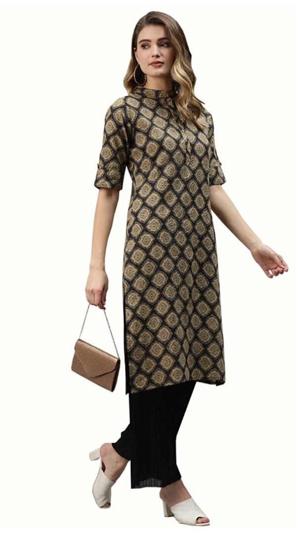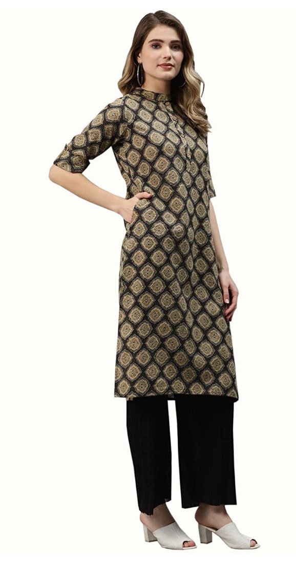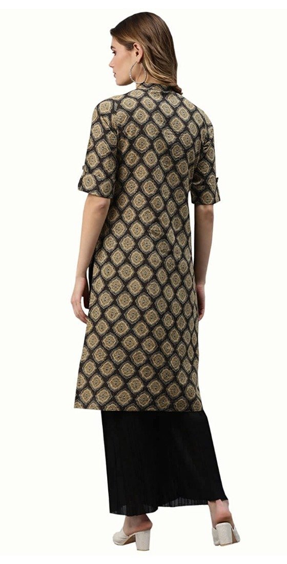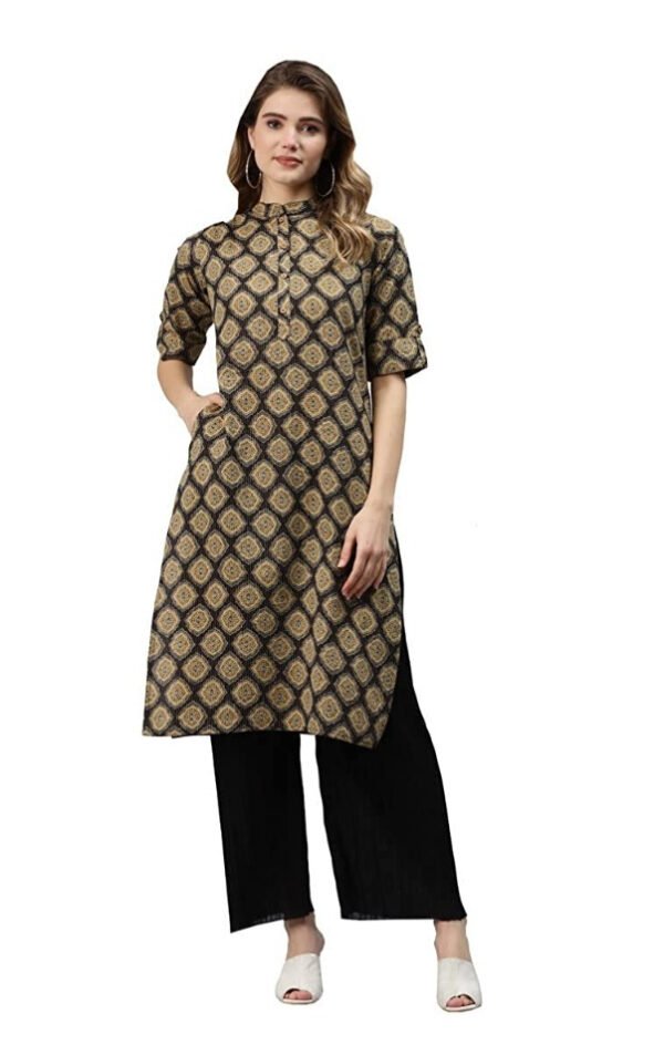 Generic Women’s Cotton Printed Straight Fit Kurti (Black, Cotton)