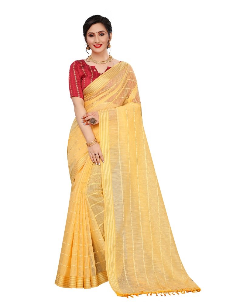 Women’s Cotton Saree With Blouse (Yellow, 5-6Mtrs)