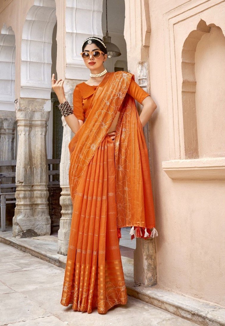 Generic Women’s Cotton Stripe Foil Pattern Saree With Blouse (Orange, 5-6 Mtrs)