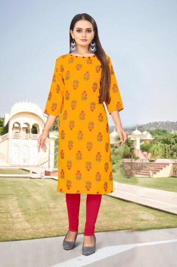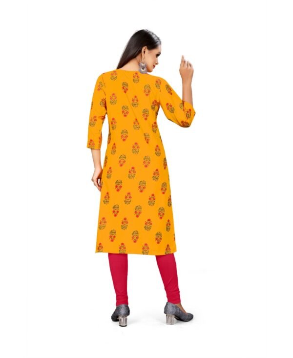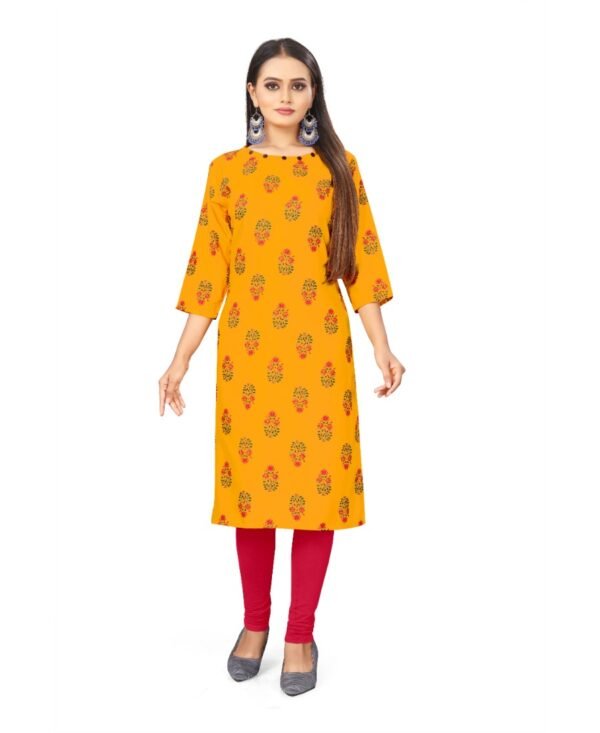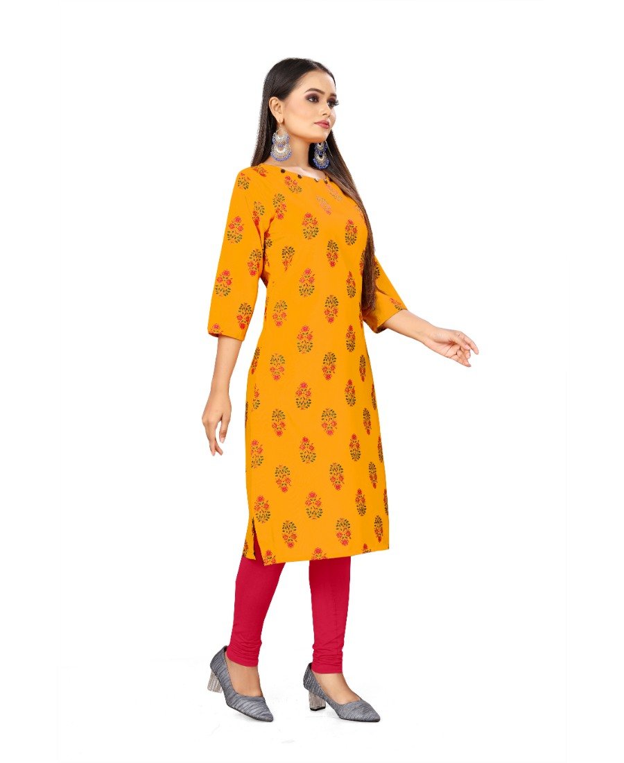 Generic Women’s Digial Print Rayon Regular 3/4th Sleeve Knee Length Kurti (Mustard)