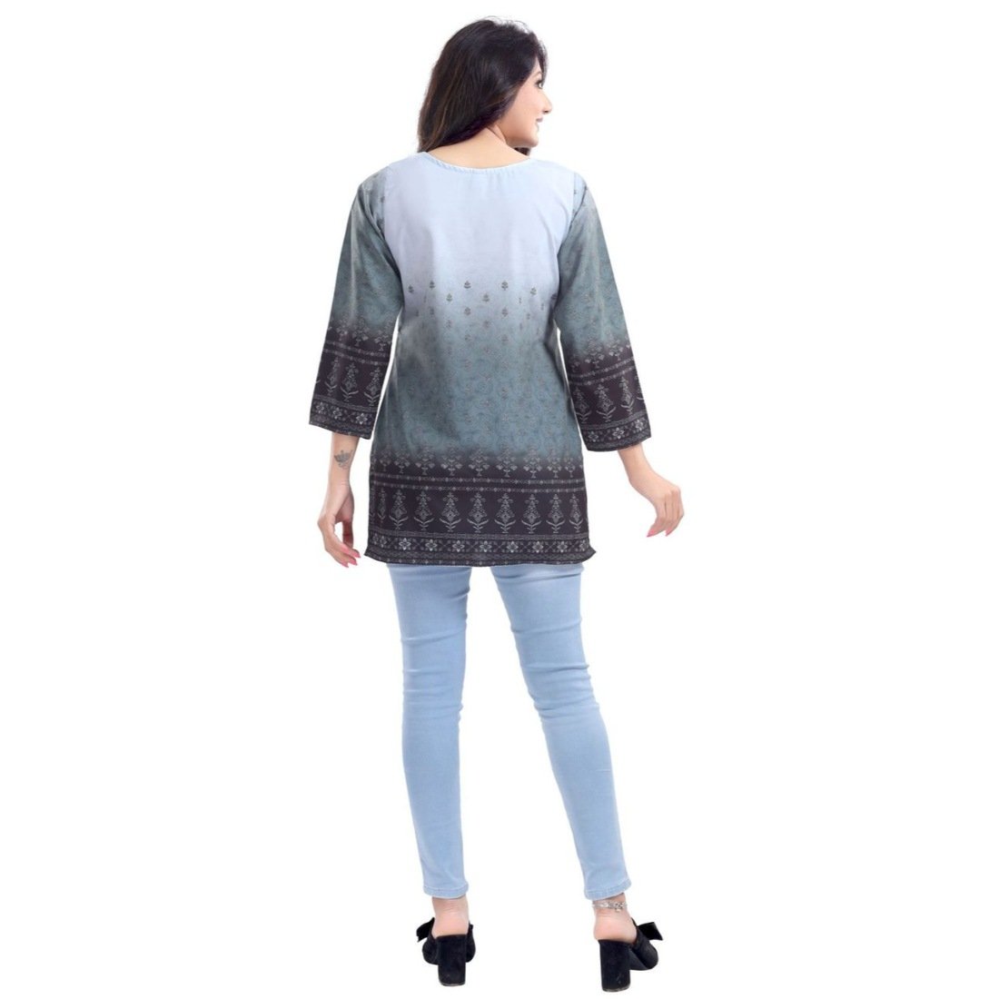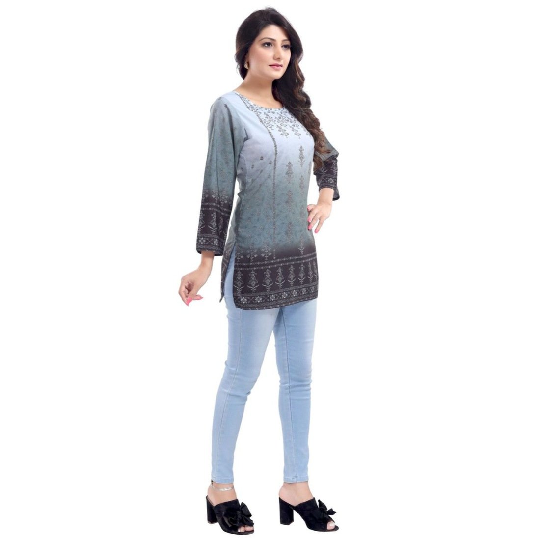Generic Women’s Quarter Sleeve Faux Crepe Printed Short Kurti Tunic Top (Color:Grey)