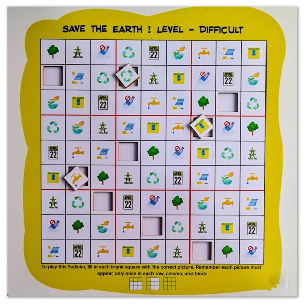 It includes 1 wooden Sudoku with board size of 10 by 10 , with cut-outs that contains some missing pieces which player have to put in the empty spaces in a way such that each object comes only once in row and column.